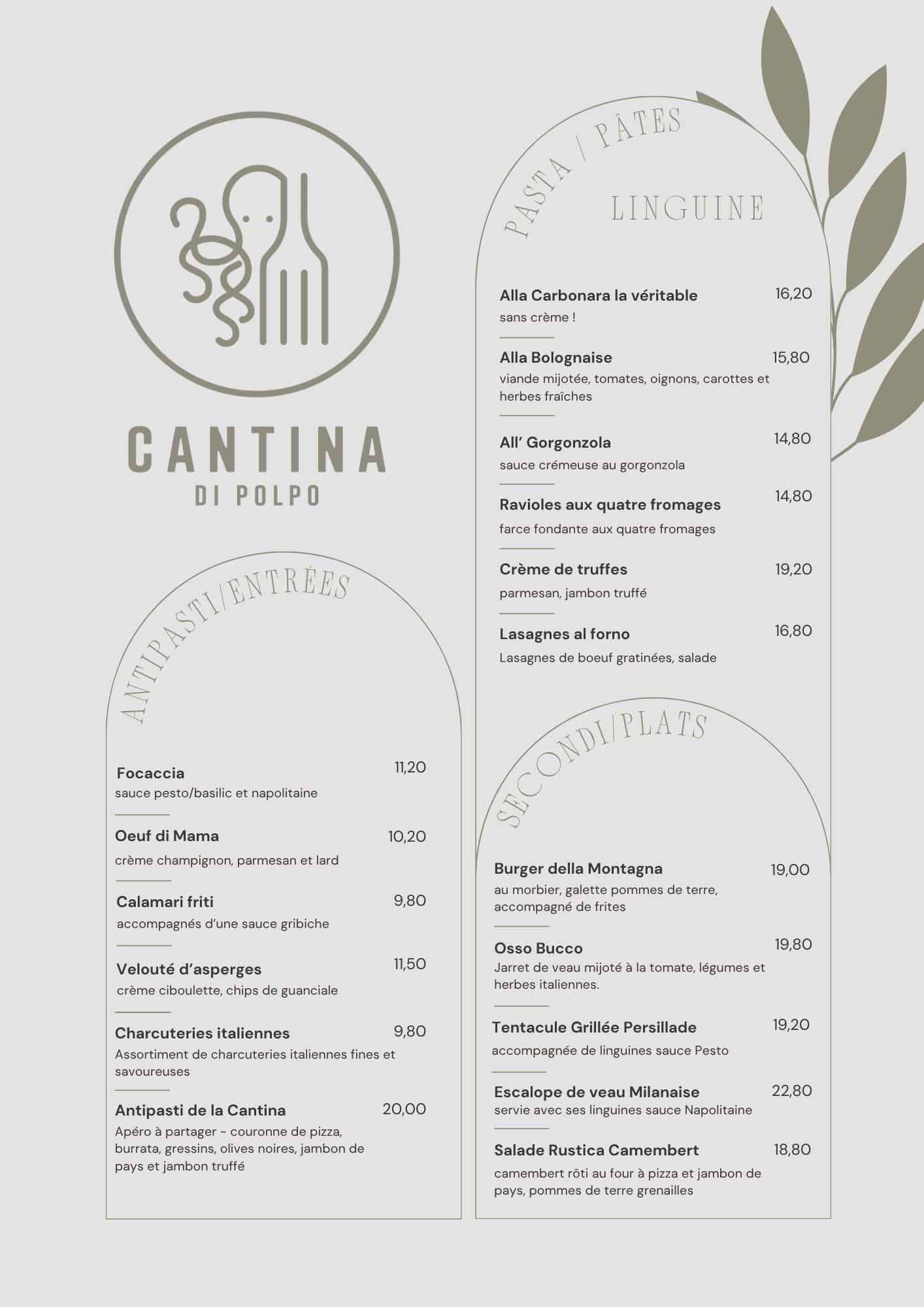 Le chef et toute l’équipe sont heureux de vous présenter la carte CANTINA DI POLPO cuisinée avec beaucoup d’amore ! Bon voyage en Italie…